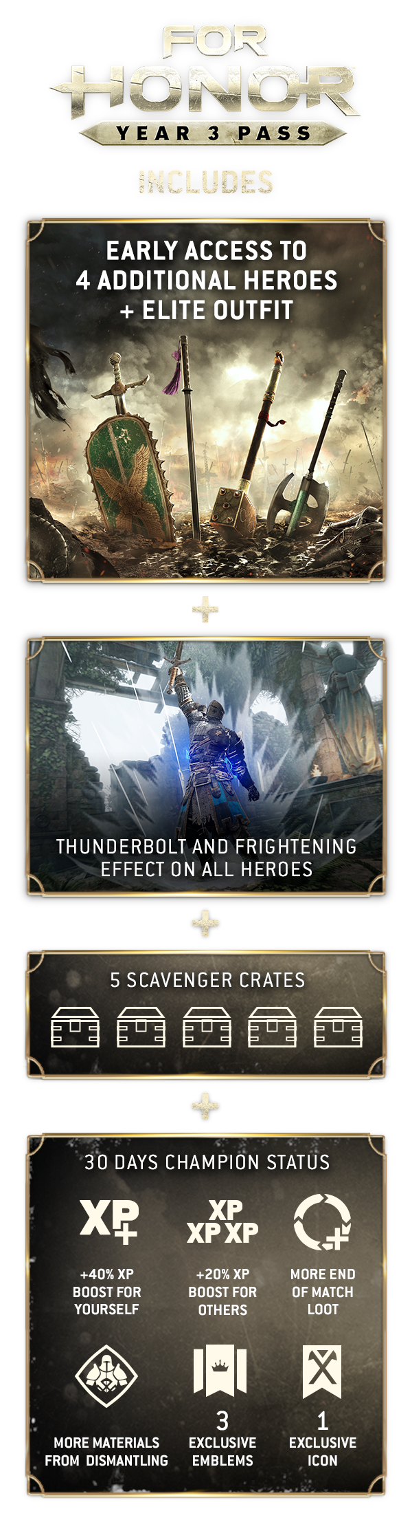 The Year of the Harbinger is upon us! Enhance your For Honor experience with the Year 3 Pass. Get VIP early access to 4 new Heroes, plus exclusive bonus content.